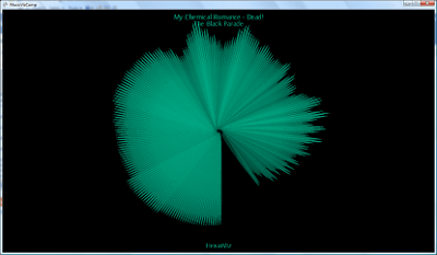 The way to retrieve music visualization data from XNA is very simple. Call the MediaPlayer.GetVisualizationData method in XNA 3.0 or later, and you will retrieve an object of type VisualizationData. The VisualizationData class provides only two properties, Samples and Frequencies. The former is an array of 256 float values from -1.0 to 1.0 indicating the raw amplitude of the currently playing sound sample. The latter is an array of 256 float values from 0 to 1.0 indicating the logarithmic scaled power value of each frequency band in the currently playing sound sample – essentially the result of a FFT on the sound data. The frequency distribution seemed like a more obvious choice to use in a visualizer, so that’s what we used.